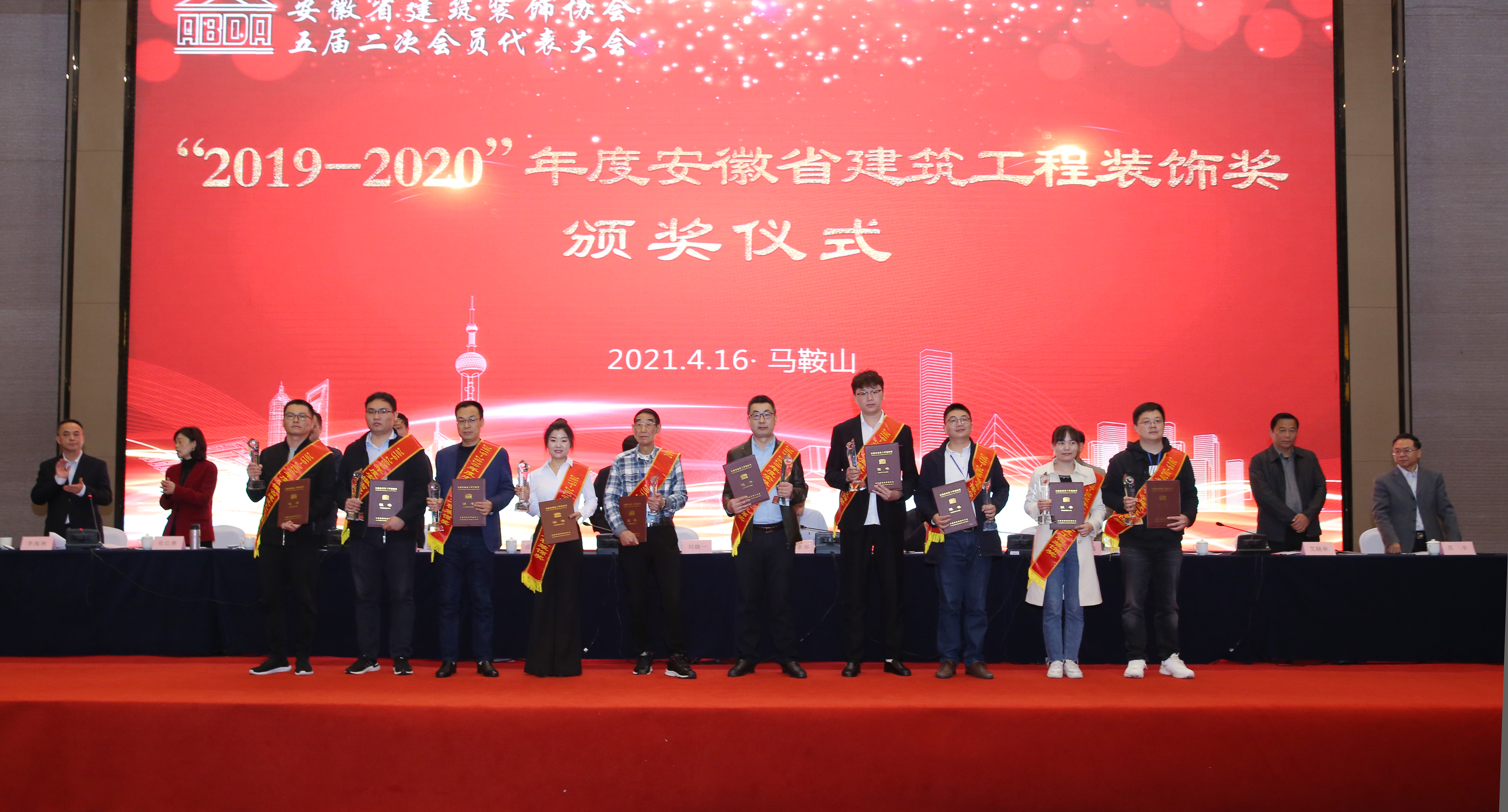 4月16日,安徽省建筑裝飾協會五屆二次會員代表大會在馬鞍山舉行。會上對“2019-2020年度安徽省建筑工程裝飾獎”進行了隆重頒獎。我公司憑借精湛的工程質量榮獲3項“安徽省建筑工程裝飾獎”,并獲“對新冠疫情作出奉獻單位”表彰。