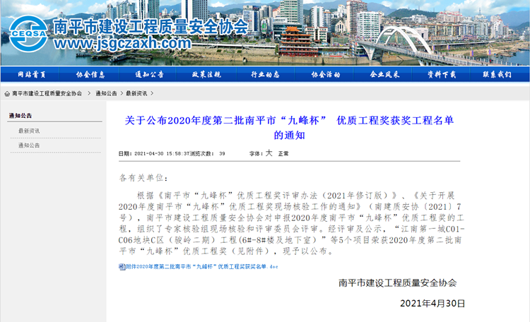 喜訊!公司兩項(xiàng)工程獲福建省南平市 “九峰杯”優(yōu)質(zhì)工程獎(jiǎng)