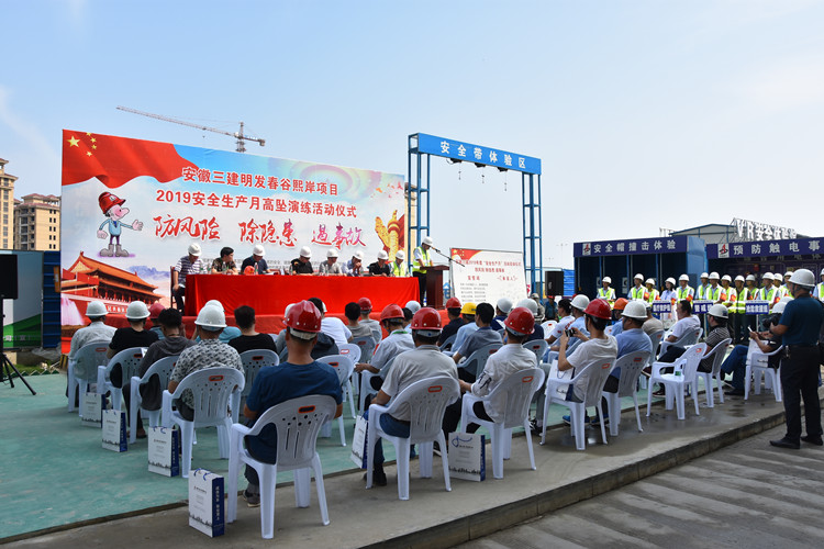 本次專題演練活動由安徽三建公司、明發集團蕪湖房地產開發有限公司、繁昌縣建筑質量安全監督站共同主辦,相關單位及建筑企業80余人參加活動并進行觀摩。繁昌縣住建委副主任方躍,繁昌縣質量安全監督站站長王擁軍、繁昌縣質量安全監督站安全負責人盧華臣出席本次演練活動。