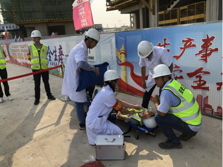 本次活動項目部精心策劃,編制了《防高空墜落事故應急預案》,明確責任分工,成立了搶險救援組、安全警戒組、醫療救護組、事故通訊組和后勤保障組。演練模擬施工人員從外架作業平臺墜落,迅速啟動應急救援預案的全過程。應急援救預案啟動后,各小組接到命令后趕赴事故現場,各司其職,相互配合,有序開展了緊急援救,演練活動順利完完成。