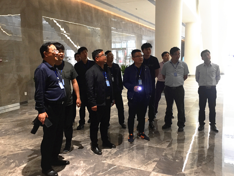 觀摩中,孫俊中對所有項目人員表示親切的慰問,在現場聽取了項目負責人王皖對安徽創新館整體建設情況介紹。隨后孫俊中一行參觀了二號館、三號館。裝飾公司項目經理劉維向觀摩團介紹了二號館室內環氧磨石工藝、PVC石塑地板鋪貼技術以及三號館全球路演中心超大型藝術造型鋼板安裝技術等等。館內光可鑒人的環氧磨石地面、輕質飄逸的穿孔鋁板、氣勢宏偉的路演中心給孫俊中一行留下深刻印象。