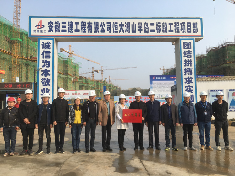 2019年11月8日上午,公司“工人先鋒號”驗評小組一行前往十一公司天長恒大湖山半島項目,對項目申報的安徽三建“工人先鋒號”進行驗評并授牌。