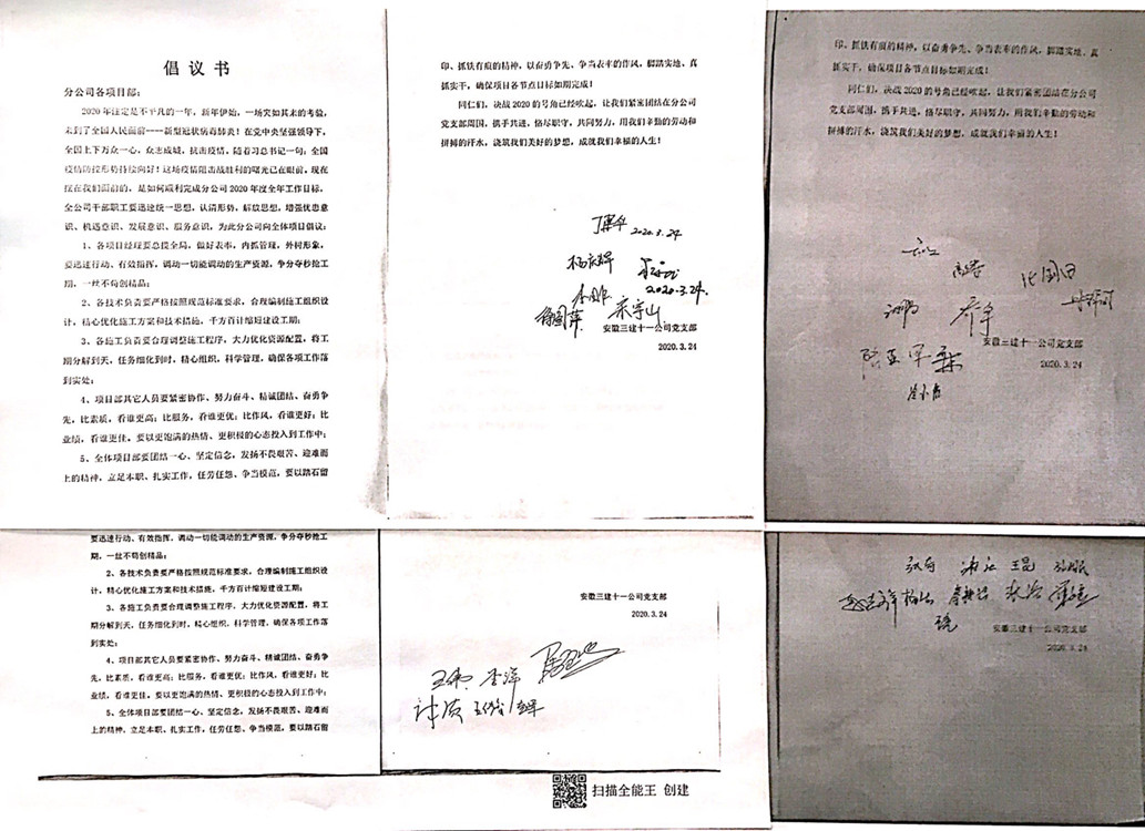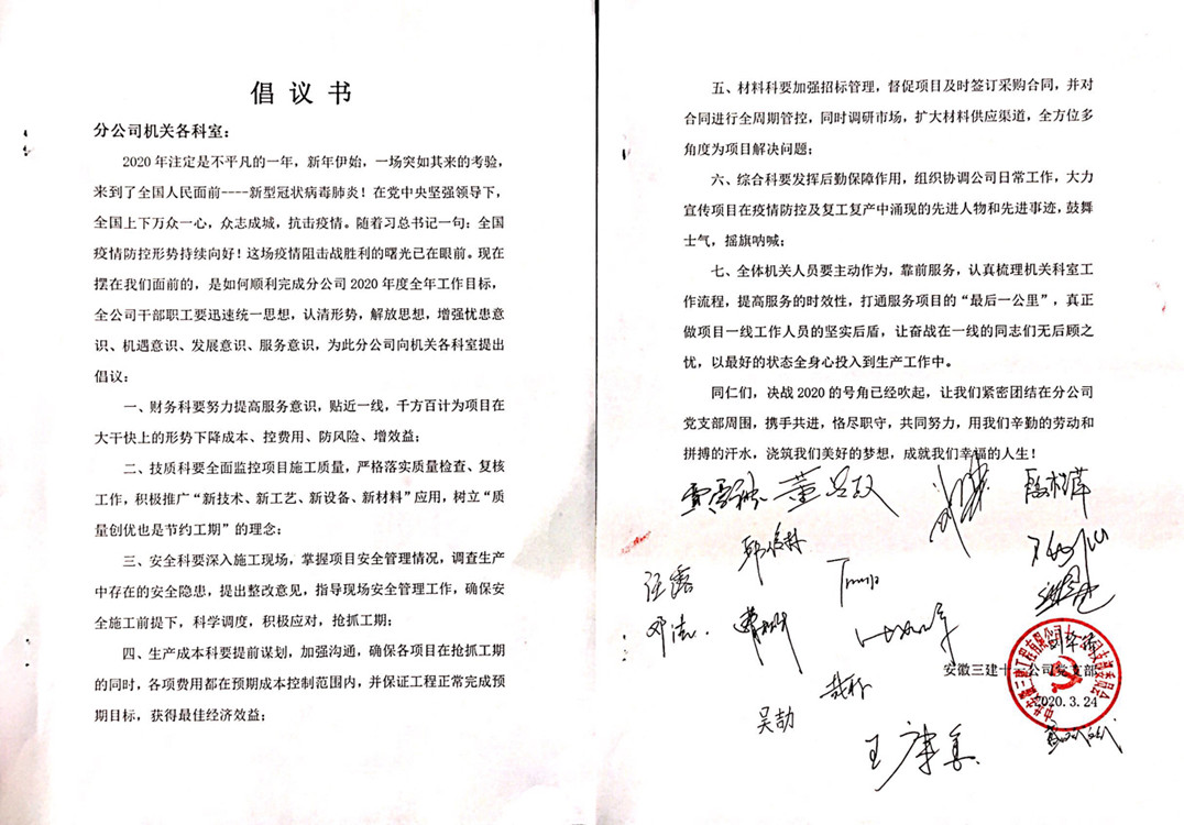 分公司黨支部在倡議書中號召,全體項目部要團結一心、堅定信念,發揚不畏艱苦、迎難而上的精神,腳踏實地、真抓實干,確保項目各節點目標如期完成;全體機關人員要主動作為、靠前服務,加強溝通、積極宣傳,一切圍繞項目進度開展工作,保證服務的時效性。