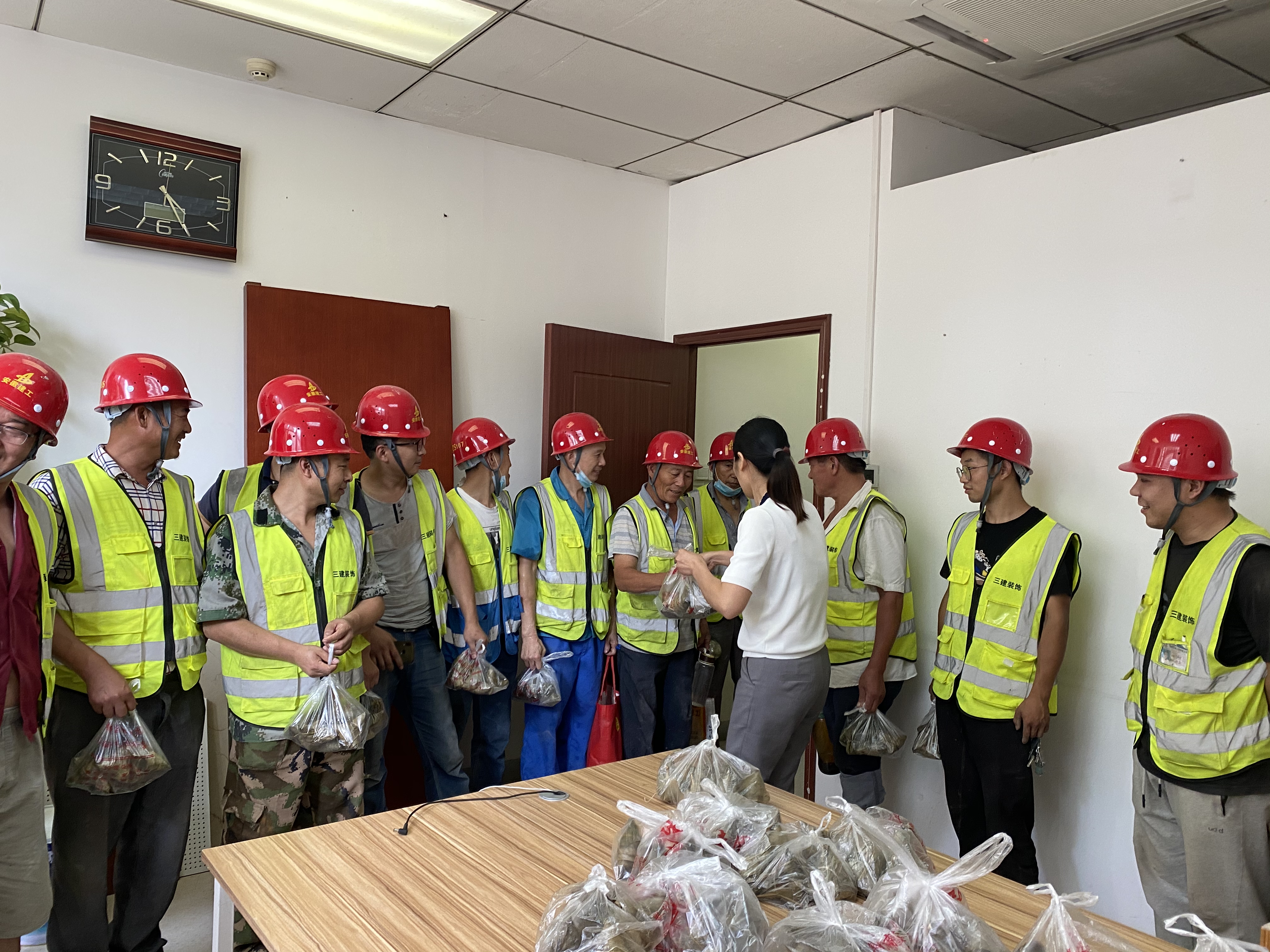 圖為翡翠廣場項目部管理人員為工人發放粽子