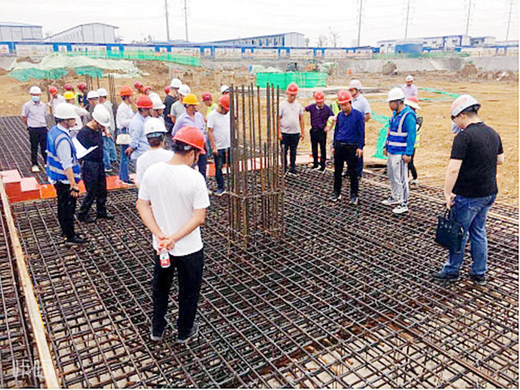圖為觀摩團一行觀摩現場鋼筋綁扎工序