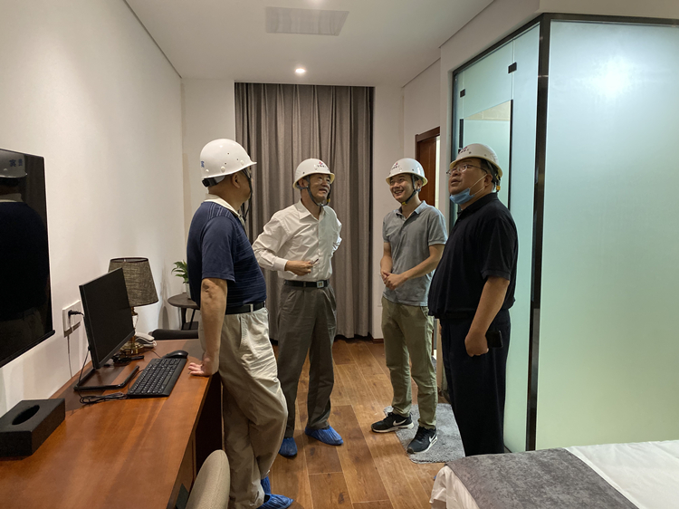 鄭成雨一行深入施工現場,詳細聽取了項目負責人關于樣板間制作以及下一步施工計劃等有關工作的匯報。鄭成雨在調研中對本項目整體設計布局、家具家電和設備材料選型以及樣板間制作進度、質量給予了充分肯定,尤其對本項目石膏板吊頂采取的防開裂措施以及室內防水措施予以高度評價。