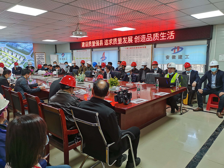 在項(xiàng)目會(huì)議室,項(xiàng)目負(fù)責(zé)人高劍介紹了項(xiàng)目工程概況,重點(diǎn)介紹了項(xiàng)目在質(zhì)量、安全等方面管理措施以及施工亮點(diǎn)等。隨后,全體觀摩人員深入項(xiàng)目施工現(xiàn)場(chǎng),觀摩了項(xiàng)目現(xiàn)場(chǎng)工程質(zhì)量及安全文明相關(guān)措施,相關(guān)領(lǐng)導(dǎo)對(duì)項(xiàng)目現(xiàn)場(chǎng)的各項(xiàng)管控措施及取得的成績(jī)給予了高度的評(píng)價(jià),并充分肯定了安徽三建作為國(guó)有企業(yè)的責(zé)任意識(shí)和擔(dān)當(dāng)精神。