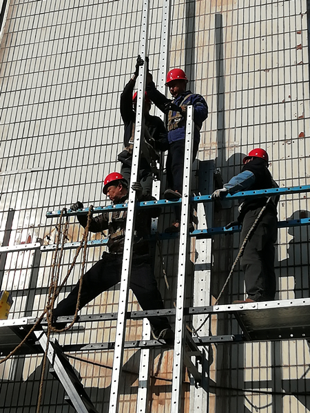 2月18日大年初七,輕鋼龍骨公司廠區內一派繁忙,金加工車間主任陳金濤帶領著師傅們正在緊張忙碌著安裝升級版整體附著式升降腳手架(智能爬架)樣機,經過三天的加班加點,順利完成了3個機位的拼裝和爬升,靚麗的新爬架矗立在輕鋼龍骨公司大樓上,展示出蓬勃昂揚的新氣象。