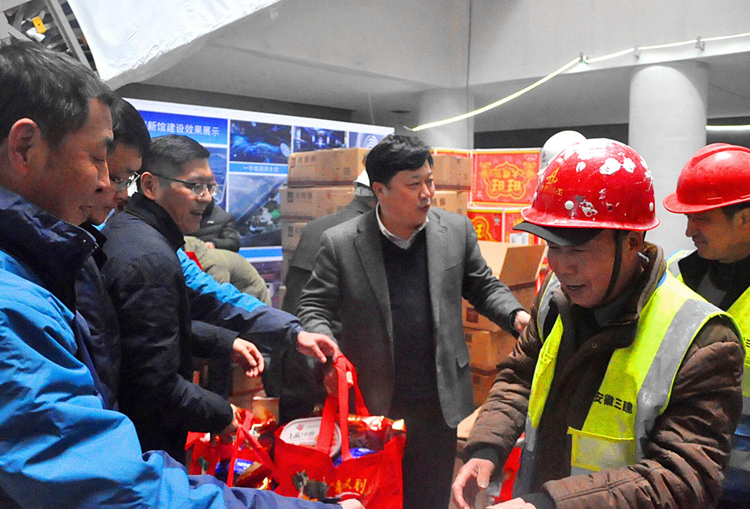 2月2日上午,在新春佳節即將來臨之際,公司總經理、黨委副書記何洪春、紀委書記、工會主席李家保、副總經理李建成組成慰問工作組,深入安徽創新館項目部一線,給依然奮戰在項目一線的廣大員工和工人送去了新春祝福以及春節慰問品。