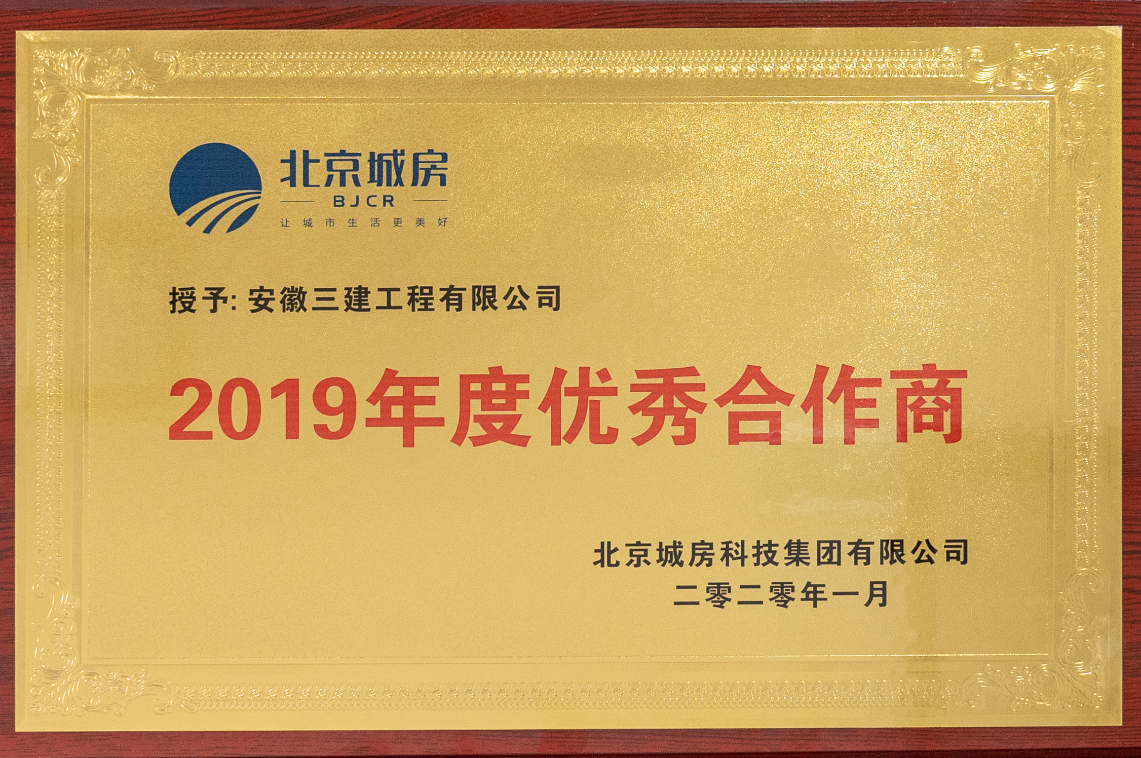 1月14日下午,北京城房集團在合肥濱湖白金漢爵酒店舉行的2019年度城房集團優秀供應商表彰大會,安徽三建榮獲2019年“優秀合作商”榮譽稱號,并獲得20萬元獎勵。