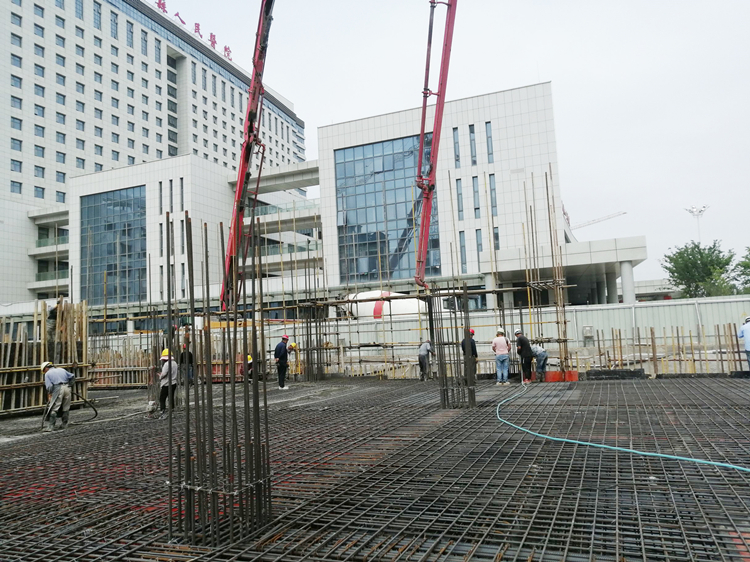 假日期間,十公司動力三村項目地下室第一塊頂板澆筑混凝土抓緊時間有序施工,為了保障澆筑工作順利進行,項目部還組織黨員同志為一線工人送清涼。圖為澆筑現場。