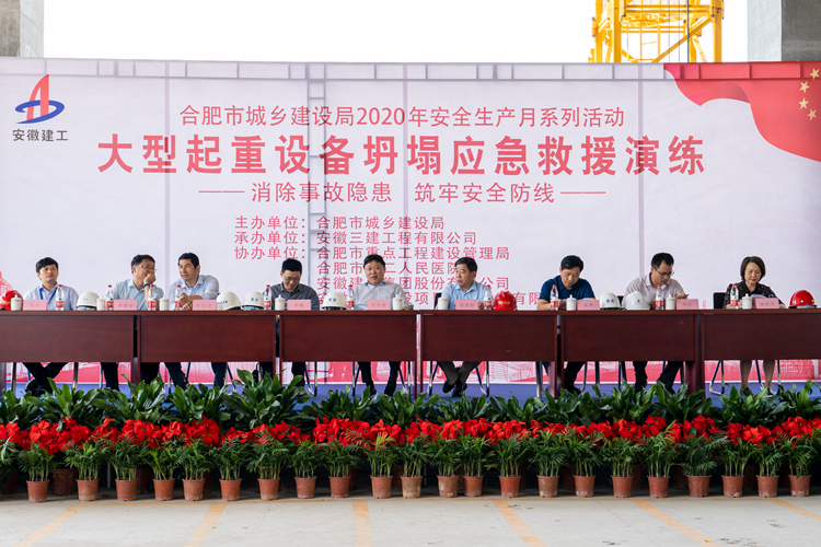 本次應(yīng)急救援演練活動(dòng)由合肥市城鄉(xiāng)建設(shè)局主辦、安徽三建工程有限公司承辦。合肥市城鄉(xiāng)建設(shè)局質(zhì)量安全處副處長(zhǎng)胡景琦、合肥市建筑質(zhì)量安全監(jiān)督站副站長(zhǎng)孫巍、合肥市重點(diǎn)工程建設(shè)管理局公益分局項(xiàng)目辦主任周松、合肥市二院副院長(zhǎng)魏敦英、安徽建工集團(tuán)工管部(安全監(jiān)察局)副局長(zhǎng)葛輝、安徽南巽建設(shè)項(xiàng)目管理投資公司董事長(zhǎng)李培貴以及安徽三建黨委副書(shū)記、總經(jīng)理何洪春、副總經(jīng)理李建成等出席活動(dòng)。安徽三建所屬各單位分管領(lǐng)導(dǎo)、安全科長(zhǎng)、合肥地區(qū)項(xiàng)目經(jīng)理及項(xiàng)目安全負(fù)責(zé)人等100余人現(xiàn)場(chǎng)參加活動(dòng),行業(yè)內(nèi)部5千余人網(wǎng)絡(luò)在線觀看活動(dòng)直播。
