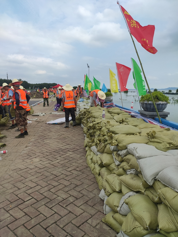 在連續(xù)奮戰(zhàn)三天后,合肥雨勢暫歇。然而未及休整,23日早7:30分,公司接到合肥市包河區(qū)相關(guān)單位緊急通知,前往環(huán)湖北路十五里河橋以東200米處搶險。公司立即組織行動,組織協(xié)調(diào)一分公司、三分公司、六分公司共計約120人,順利搶筑堤壩150米。
