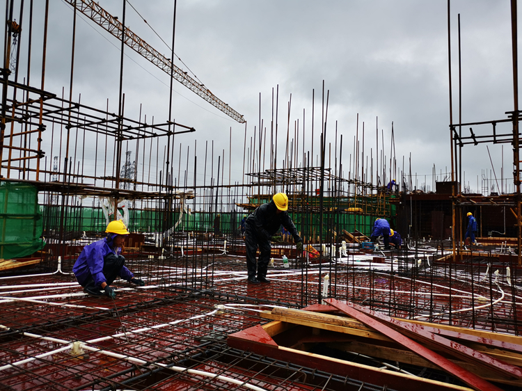 一公司:武漢華發中央公園、湛江力高悅璟灣項目組織職工深刻學習領會十九屆五中全會精神,以全會深刻內涵推動項目高質量建設。圖為湛江力高悅璟灣項目鋼筋班組冒雨捆扎鋼筋。