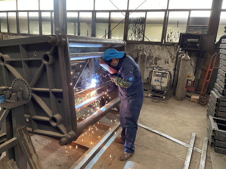 門窗公司女工王來菊在車間工作區域進行材料加工工作,搶門窗生產進度